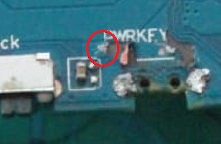 Под кнопкой power внизу такой коричневый "жучек". Это и есть конденсатор. На его левый вывод и пробуй зацепиться. Точка чуть выше - то же самое. |