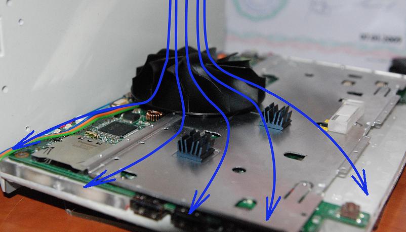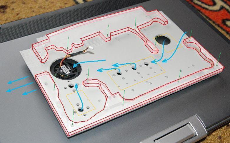 для уменьшения нагрузок плата установлена на основание из оргстекла (а не на стойки) плата полностью ложиться на основание в тех местах где на ней нет элементов, и притянута винтами (зеленые стрелки). основание выделено красным.. такая конструкция очень жестко поддерживает материнку.. Вложение 10489 охлаждением нижней части платы занимается центробежный вентилятор, тот что и был в ЕееРс. поток воздуха (показан синими стрелками) обдувает основные "теплые" места на плате - память и т.п. шлейф LCD матрицы - штатный. проходит под платой к инвертору, это видно на других фото. при такой конструкции ничего удлинять не надо. |