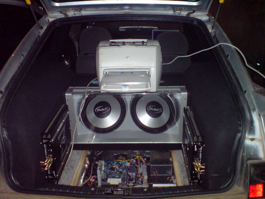Мой аппарат Вложение 16159 Кстати обвес делал сам(Зацените) И так началось все, еще в 2005 году. Делалось все с трудом т.к спросить было не у кого. Поэтому пошел по своему пути, а уж судить как у меня это получилось ВАМ.Еще хочу сказать что на тот момент все делалось чисто под МУЗЫКУ. Всевозможных GPS, камер заднего вида и т.д здесь нет. Они мне попросту не нужны.ПОКА! Данные по PC 1. Мать( Какая точно не помню, вроде ASUS ??? ) 2.Проц 4-й пенек 2.4ГГц 3.Звукавуха Sound Blaster X-Fi Xtreme (6-ти канальная) 4.Видюха NVIDIA GeFORCE 6600 Данные по компонентам музыки 1. 2 4-х канальных усилка MAC Audio 2. 6 колонок тоже от MAC Audio 3. SUB все той же фирмы Комп у меня собран на фанерном листе, вырезанном по форме ниши от запаски.Короче лежит он у меня вместо запаски, поэтому проблем с компоновкой не было. Вложение 16166 Вложение 16167 По поводу проводки.Знаю и вижу, что не идеально. Но критиковать особо не стоит.Почему? Да потому, что работает это все ,уже 5 год(Без проблем) Вложение 16168 Снаружи все это выглядит так Вложение 16165 Вложение 16169 Белый прямоугольник слева- там раньше был DVD-ROM(Убрал за ненадобнастью)Сейчас там USB разъемы. Справа как вы уже поняли съемный Винт(Удобно!!! В сильные морозы всегда забирал домой.) Кстаит винт 2-ой, первый прожил 3 года Вложение 16170 Вложение 16162 Вид ночью Вложение 16157 Фотка с открытой крышкой только такая.Другой нет, а открывать только ради фотки не охота.На принтер внимание не обращаем(это отдельная история). Теперь о питании(компьютера) Питается все от двух АКБ 1.Штатная 75А*ч 2. от UPSа 15А*Ч (Спрятан за левым усилком) через инвертор(на тот момент ни чего лучше не придумал) Монитор Монитор у меня 15"!!! Кто скажет, что это не удобно-не соглашусь. Конкретно в моем и для меня случае ВСЕ удобно Вложение 16158 На первый взгляд, может показаться, что монитор висит на соплях. НО уверяю вас это не так.Монитор висит мертво(НЕ скрипит,НЕ дребезжит в общем все РОВНО) Вложение 16160 Вложение 16161 Управление Вложение 16163 Слева на право 1.тумблер-Влючает питание 2.Тумблер-Вкл питание усилка(Работают 4 передних динамика) 3.Тумблер-Вкл питание усилка(Работают 2задние колонки и SUB) 4. Кнопка по серидине-Запуск системы 5. 3 правых тумблера к PC отношение не имеют Четыри верхние(синие) кнопки это управление Winamp-ом через COM PORT. на каждой кнопке висит несколько действий. Короче для музыкальных потребностей этих кнопок достаточно. Для остальных потребностей есть мышь Вложение 16164 Кстати ,кто не заметил,сиденьев сзади нет. Не вписывались в концепцию проекта (Шутка!) Вроде ВСЕ. |