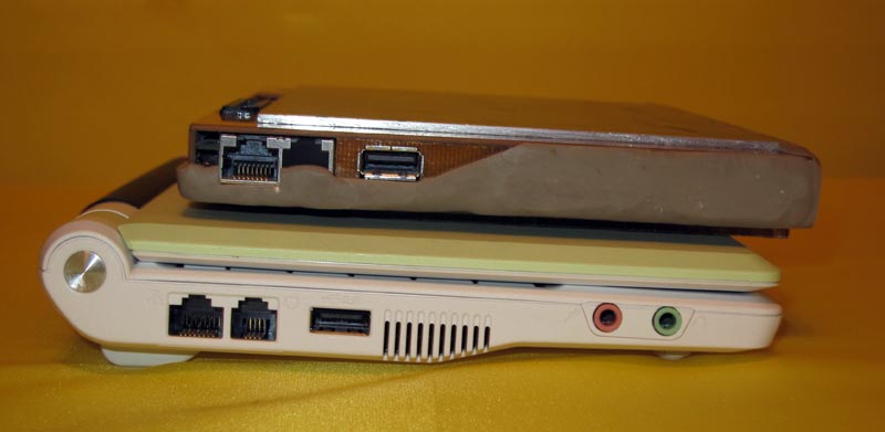 +комп в этом проекте не основное звено, а скорее - "управляющий в тени". Комп: вернее тестовая версия, еще требует серьезной доработки напильником)) Собран на базе ЕееРС701, Корпус из текстолита и эпоксидки. Вложение 18876 Вложение 18877 размер компа чуть меньше оригинального Еее701 Вложение 18879 Вложение 18878 на задней стороне пластина для пассивного охлаждения и универсальный разъем. в разъеме: питание 9,5В, контакты батареи, управление куллером, USB, аудио, кнопка включения.. Вложение 18880 такой моно-модуль может быть использован как во встроенном варианте, так и в виде отдельного устройства. в моем проекте предполагается нечто подобное: скорее всего в моторизованном варианте ) Вложение 18881 |