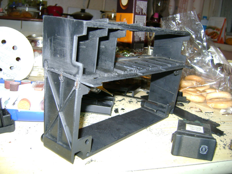 Вложение 19529 Вложение 19530 Блок переключателей печки отпилен. Вложение 19531 Теперь отпиливаем отсек для магнитолы. Отпилили, и у нас остались блок кнопок и воздуховоды: Вложение 19532 Теперь необходимо отделить воздуховоды от блока кнопок. Пилим: Вложение 19533 И вот перед нами отпиленный блок кнопок: Вложение 19534 Теперь мне надо соединить блок переключателей печки с блоком кнопок. У блока кнопок есть технические полости, из-за которых не приклеить блок печки. Эти полости я заделал, и теперь появилась площадка для приклеивания блока переключателей печки. Вложение 19535 Зашкурил: Вложение 19536 Вложение 19537 Теперь скрепляем, клеим, паяем и впаиваем скобки: Вложение 19538 И вот что получилось. Как и планировалось, удалены воздуховоды с отсеком для магнитолы и соединены между собой кнопки с печкой: Вложение 19539 Вложение 19540 |