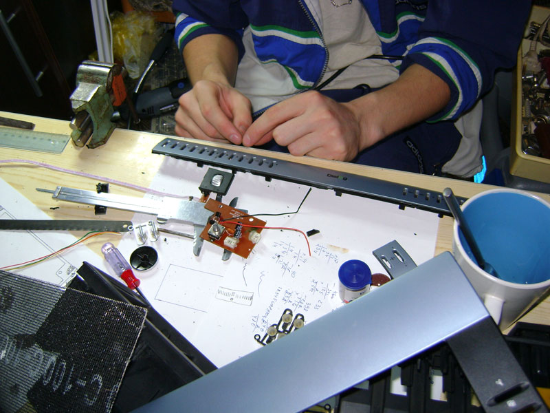 Вложение 19542 Вот и мозги: Вложение 19543 Все необходимые части отпилены. Часть с кнопками, мозги и колесо прокрутки: Вложение 19544 Т.к. площадка под колесо прокрутки оказалась короткая, пришлось наращивать. Вложение 19545 потом скрепил скобками: Вложение 19546 и запаял с внутренней стороны: Вложение 19547 получилось так: Вложение 19548 Теперь, чтобы получить ровный ряд кнопок, подгоняем расстояние между ними. Вложение 19549 Вложение 19550 Так с каждой частью. Получилось шесть частей. Вот прикинул как должно выглядеть. Вложение 19551 |