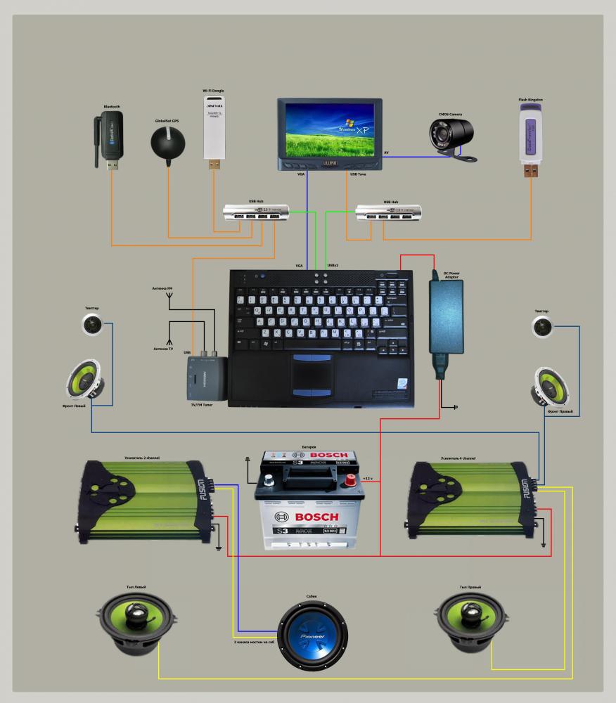 Собираюсь ставить карпс, но еще не все комплектующие приехали, а пока они едут я набадяжил красочную схемку своего будущего компа, как я это представляю на данный момент, начитавшись целую гору инфы. Комплектующие на схеме не все мои, половина (в основном касаемо звука) фотки из нета. Собственно просьба к людям понимающим глянуть, может что не так, может что лучше сделать. Схемы часто не рисую, так что если где-то что-то не так обозначено - просьба ногами не пинать. Что провода силовые к компу и к усилку нада оба тянуть - знаю, просто дабы схему не нагружать и не делать ее нечитаемой решил землю обозначить так. Картинки толком вставлять не умею, вставил как мог. В конце файл прикрепил полноразмерный. Вложение 22939 Вопросы в основном такого плана: 1. Какой лучше взять USB хаб, с внешним питанием или можно просто разветвитель??? Потянет ли неактивный хаб скажем TV тюнер + GPS приемник + Wi-Fi + Bluetooth. У меня в буке всего два USB 2.0 один 1.0. Если брать активный - то опять вопрос: чем его питать??? Где найти 5 Вольт да еще и 3,5 A примерно (7 портов - на каждый по 0,5А для полноценного USB). 2. Для питания бука приобрел автомобильный адаптер 7-18,5В 80Вт. Работает отлично, при просадке (когда стартер крутит скажем) бук не отключается, но напруга чуток гуляет и после блока. С этим нужно бороться или пусть гуляет. Не догулялась бы до чего:dntknw:, а если бороться то как??? 3. Кто что может плохого или хорошего сказать про моник от промэлектроники MI0800ET??? http://www.promelec.ru/company/news/451/ Схема полноразмерная http://radikal.ru/F/s016.radikal.ru/...6ed5c.jpg.html И еще http://s016.radikal.ru/i334/1107/11/2f12a0f6ed5c.jpg |