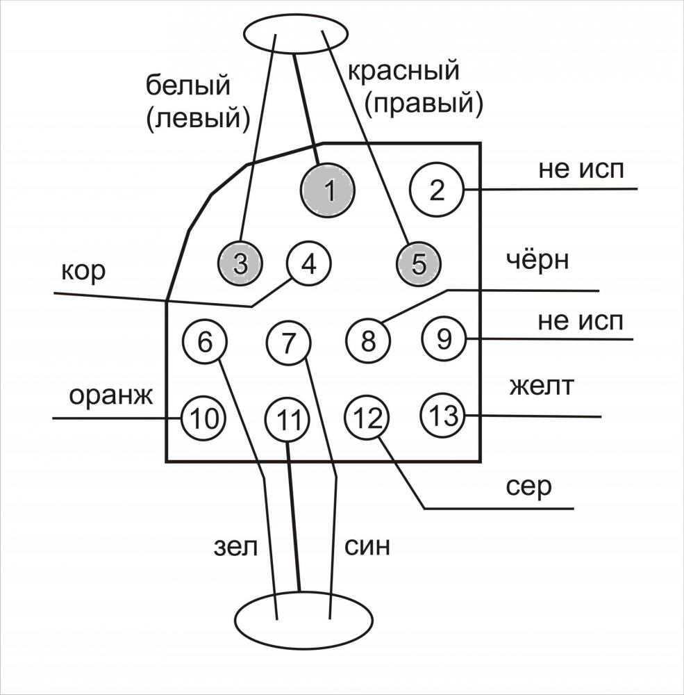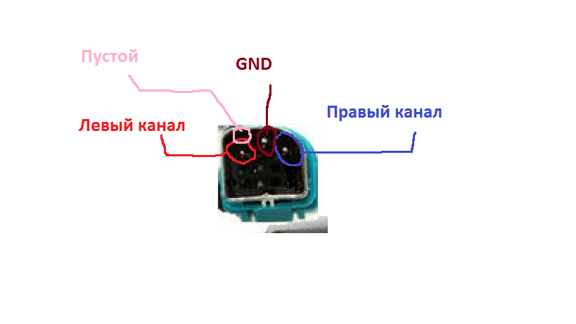 белый-левый канал красный-правый жёлтый -зелмя но у тебя помоему 1 вывод В гугле дофига этих распаек