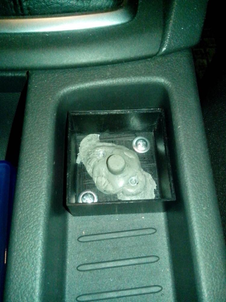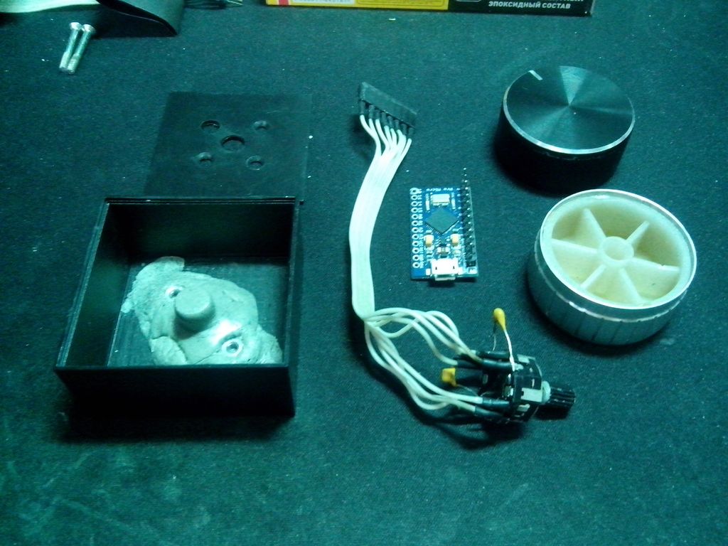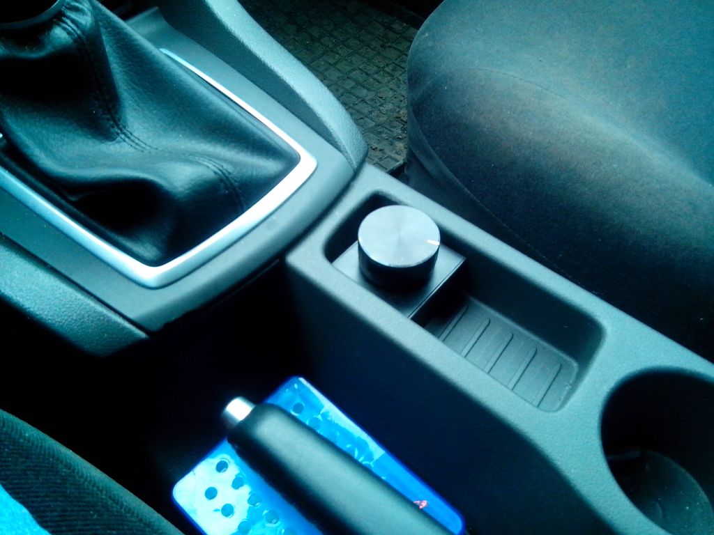 Мне всегда нравились лаконичные и простые интерфейсы управления, вроде iDrive у BMW, и всегда хотелось сделать что-то подобное. Приступим. За основу была взята идея и реализация земляка, с некоторыми изменениями под свои нужды. Спасибо ему за готовый скетч и консультации. Основой является плата Arduino Pro Micro, имеющая сверхкомпактный размер, порт micro-usb для питания и передачи сигналов, и умеющая "прикидываться" медиа-клавиатурой. Также мне понадобился хитрый джойстик: Alps RKJXT1F42001, который умеет наклоняться вверх, вниз, влево и вправо; имеет центральную кнопку; совмещен с энкодером (может вращаться влево/вправо). Именно он стоит во многих магнитолах вроде Pioneer и Alpine. Оба компонента были куплены на радиорынке. Там же было приобретено несколько компактных корпусов, пара ручек-крутилок, провода ("лапша") и пара конденсаторов для схемы. Из нескольких корпусов был выбран самый подходящий под место инсталляции - гладкий, квадратной формы, без отверстий под болты креплений. В верхней крышке было просверлно отверстие под небольшой выступ сверху на джойстике, так чтобы он садился плотно, даже фиксировался. Также пришлось наращивать единственный вал джойстика в ширину, т.к. он очень тонкий, и найти подходящую ручку к нему не оказалось возможным. Поэтому на вал с помощью все того же эпоксилина был посажен пластиковый переходник (купленный в том же ларьке, где и крутилка): Вложение 35330Вложение 35331 Чтобы при вертикальном нажатии на вал джойстика он не проваливался внутрь - в ответной части корпуса из эпоксилина был вылеплен подпор в виде небольшой башенки, а также закреплены две гайки под болты, которые будут прижимать верхнюю часть корпуса к упору (они скроются под крутилкой). Также было просверлено два отверстия для крепления готовой конструкции к панели, и одна широкая щель - для шлейфа: Вложение 35332Вложение 35333 К джойстику в соответствии со схемой распиновки были припаяны провода и два конденсатора (для устранения дребезга при кручении энкодера). В ардуино был залит поправленный скетч. Готовый разобранный комплект перед установкой: Вложение 35334 Идем в машину, примеряемся к небольшой нише между передними сидениями: Вложение 35335 Убираем резиновый коврик (в случае продажи автомобиля он вернется на место и закроет ненужные дырки): Вложение 35336 Сверлим два маленьких отверстия под саморезы, и широкую прорезь - под шлейф: Вложение 35337 Крепим нижнюю часть корпуса. Держится мертво! Вложение 35338Вложение 35339 Через совмещенные прорези прокидываем шлейф под центральный тоннель: Вложение 35340 Крепим с помощью двух болтов верхнюю часть корпуса с джойстиком: Вложение 35341 Под панелью подключаем шлейф к ардуино (спрятана в широкую термоусадку, чтобы не коротнуло), ардуино же в свою очередь с помощью usb-кабеля подключена к андроиду: Вложение 35342 Готово, окончательный вид джойстика после инсталляции: Вложение 35343 Схема работы: джойстик вверх: ___вверх джойстик вниз: ____вниз джойстик влево: ___PrevTrack джойстик вправо: __NextTrack кнопка джойстика: _Play/Pause энкодер влево: ___..Vol- энкодер вправо: __..Vol+ долгое нажатие вверх: __Home Screen долгое нажатие вниз: ___Menu долгое нажатие влево: __не используется долгое нажатие вправо: _не используется долгое нажатие кнопки: _Enter кнопка нажата + энкодер влево: __не используется кнопка нажата + энкодер вправо: _Alt+Tab Схема не окончательная и скорее всего будет меняться. С