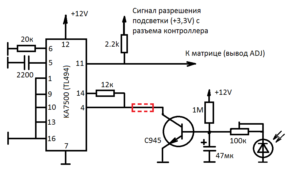 Итак, есть тип матриц, отрегулировать яркость подсветки в которых - задача не совсем простая. Причина в том, что существующий вывод матрицы "ADJ" (adjust - регулировка) функционирует только в роли ключа. Об этом явно написано в даташите на матрицу. У меня в руках одно из детищ китайской компании Chungwa CLAA089NA0ACW, поэтому процитирую ее даташит: Вложение 37309 Пункт 3 гласит: "вывод ADJ управляет яркостью, чем больше ширина импульса - тем ярче" (ну и приложен сложнейший график по сказанному)... Пункт 4 гласит, что этот сигнал мало того должен быть "0" или 3,3В, но он еще должен иметь определенную частоту - 25+/-5кГц. Ну и напоследок пункт 5 окончательно рассеивает все иллюзии у тех, кто решит перехитрить матрицу: "сигнал ADJ должен иметь высокий уровень, если не предполагается регулировать яркость, этот вывод не может иметь плавной регулировки". Вот и приехали... Значит техническое задание принимает следующий вид: - генератор на 25кГц - напряжения лог."0" - 0В, лог"1" +3,3В - управление включением подсветки от контроллера монитора - регулировка скважности импульсов от... Тут уже на вкус. Меня интересует работа с фотоэлементом. Естественно, схемотехническое решение должно быть как можно проще. Обращаемся к "народным" ШИМ: - таймер NE555 (КР1006ВИ1) не совсем подходит, потому, что регулировка скважности сильно влияет на частоту. Выход есть: поставить два таймера - один генератором, второй - регулятором скважности. Но зачем нам сложности? - драйвер MC34063 (КР1156ЕУ5) не подходит по той же причине, к тому же у него частота вообще не регламентирована - у него в качестве частотозадающего элемента используется только конденсатор. - драйвер TL494 кажется то, что надо. Частота - задается R и C, регулировка скважности реализовывается внутренними ресурсами достаточно удобно. Получилась вот такая схема: Вложение 37317 Минимум навесных элементов. Драйвер работает в однотактном режиме (вывод 13 на общем проводе), выход у меня использован один - вывод 11 (кто хочет может использовать другой - вывод 8). Поскольку этот выход с открытым коллектором, оказалось достаточным подать через резистор 2,2к напряжение разрешения подсветки прямо с контроллера монитора и снять сигнал с ножки микросхемы. Как видим, взятое с контроллера напряжение разрешения составляет 3,3В, через резистор на матрицу поступает оно же. Все согласно букве даташита. Элементы 20кОм и 2200пФ - частотозадающие и рассчитаны на работу драйвера на частоте 25кГц. Вывод 14 - это выход источника опорного напряжения (ИОН). Через резистор 12кОм (ну такой был под рукой...) оно подано на вывод 4 (управление шириной импульсов). Транзистор изменяя проводимость между выводом 4 и общим проводом и осуществляет регулировку ширины импульсов. Транзистор управляется при помощи фотодиода. В затененном состоянии его сопротивление велико (порядка нескольких мегаом) и на базу транзистора подано смещение через 1МОм. В этом состоянии транзистор открыт и вывод 4 микросхемы зашунтирован на общий провод. Длительность импульсов минимальная, яркость - тоже. Как только фотодиод освещается, его сопротивление падает до десятков килоом, транзистор закрывается и вывод 4 оказывается оторванным от общего провода, напряжение ИОН полностью поступает на вывод 4, ширина импульсов максимальная, яркость - тоже. Конденсатор обеспечивает инерционность изменения яркости. Чем его емкость больше - тем медл