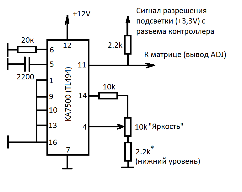 была собрана нижняя схема (без фотоэлемента). для работы с моей матрицей в схеме регулятора , по совету Leobor ,было изменено ; резистор с 6 ноги микросхемы на 120 кОм , а c 5 ноги микросхемы конденсатор изменён на 0,047мкф . всё работает нормально . подключение https://yadi.sk/d/8pLPeYivrNr3f предоставлено Leobor. моя матрица; http://www.yslcd.com.tw/docs/product/B101EVT03.1.pdf |