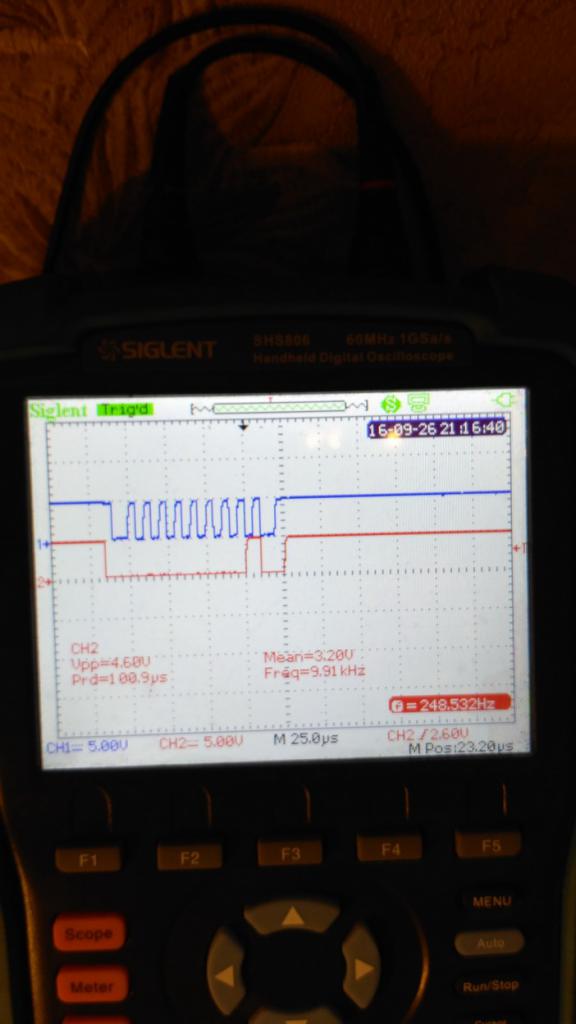 Вложение 44893 Синяя – SCL Красная – SDA (наши данные). Если Посылать данные на другой адрес (например 0х44), то форма красной линии меняется. Если я загружаю другой скетч, то осциллограмма не меняется: PHP код: