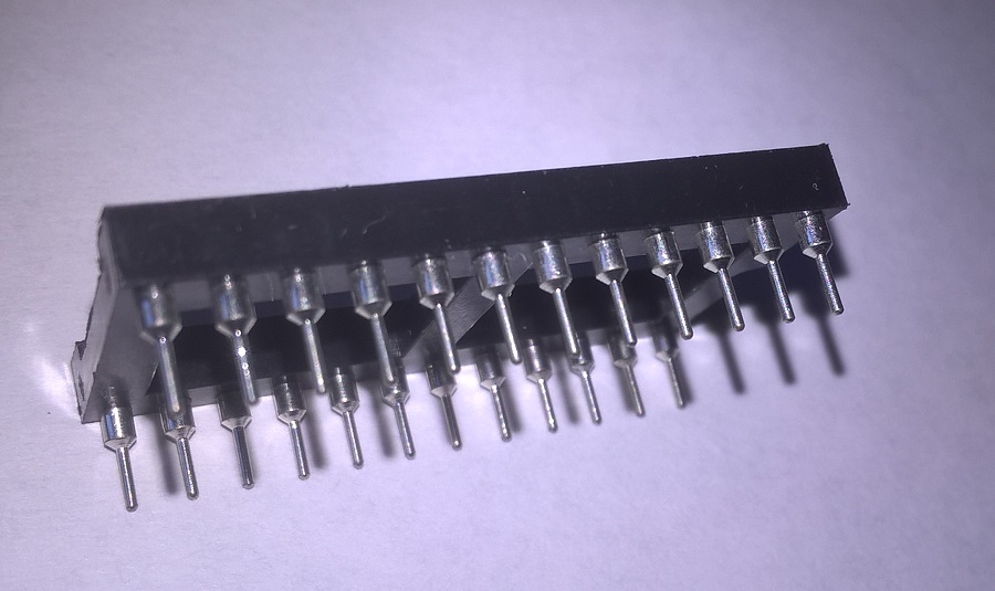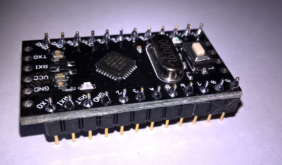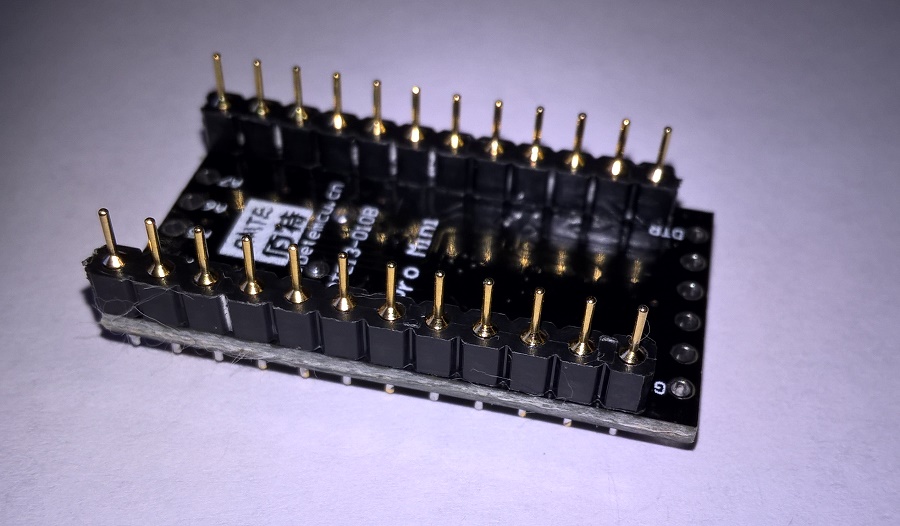 Не всегда можно использовать гнездо на плату со сквозным вариантом пайки контактов для установки плат Arduino. Ниже один из съемных вариант платы Arduino Pro Mini на плате с поверхностным монтажом. Использую цанговые панельки для микросхем, как очень надежное соединение и соответственно цанговые однорядные контакты (они с цилиндрическими контактами).