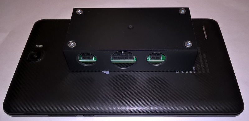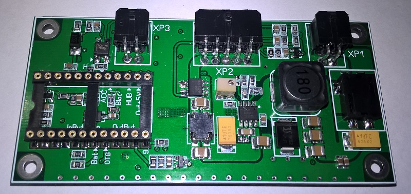 Ниже одна из крайних версий распределителя, который подходит для питания любых планшетов или одноплатных компьютеров с напряжением питания до +/-5В и током нагрузки до 3.0А. Блок питания выполнен на четырёхслойной плате по авторской топологии. В этой версии (на микросхеме MP1584) два канала «развязаны» друг от друга и от внешнего источника питания отдельными синфазными фильтрами от TDK-Lambda на каждом входе (для подавления возможных помех от генератора) и отдельными EMI фильтрами BNX025H01 от Murata на выходе, добавлены танталовые конденсаторы на вход и выход, что в целом позволило существенно улучшить характеристики выходного напряжения каждого из каналов. Один канал с выходным регулируемым напряжением (вращением по часовой стрелке напряжение уменьшается, против часовой стрелки увеличивается) для подключения планшета или одноплатного компьютера, второй с фиксированным напряжением 5.2В-5.3В для подключения HUB-а. Два разъёма с проводами по краям платы имеют одинаковое количество проводов. Расцветка проводов по факту может отличаться от цветов на фотографии, но всегда остаётся неизменным жёлтый цвет провода именно на разъёме ХР3. Обращаю внимание на этот момент, чтобы в дальнейшем избежать ошибки подключения разъёмов (сечение проводов линий питания планшета и HUB-а по 0.75 мм.кв., сечение остальных проводов по 0.35 мм.кв.). Вложение 50105Вложение 50136 Вложение 50106Вложение 50214 Так же имеются каналы: - вход "InBut" для подключения внешней кнопки для управления блоком, - выход "OutBut" для подключения кнопки питания планшета или одноплатного компьютера (коммутируемая «масса»), - выход «Remout» +12В/2А для управления включением усилителя, - выход управления датчиком Холла в планшете (коммутируемая «масса»), - выход управления режимом OTG (коммутируемая «масса»), - выход в виде дополнительного канала +5.2В/0,5А для реализации варианта включения/выключения планшета «по наличию подзарядки на USB планшета». Все каналы имеют временную задержку и определённую последовательность на включение и выключение согласно программируемого алгоритма. Для управления используется контроллер Arduino Pro Mini с выпаянным собственным стабилизатором напряжения и светодиодом индикации питания (для уменьшения собственного энергопотребления). Для самостоятельного программирования рекомендую использовать программатор СР2102. "Распиновка" разъёмов на плате. Вложение 50107 Провода питания на входе (контакты 15 и 16 -"плюс", контакты 6 и 7 -"минус") сделаны двойные и каждый по 0.75 мм.кв.. Подключать нужно парами для увеличения общего сечения каждой линии питания. Для избежания возможных помех при монтаже системы в целом рекомендую, как один из вариантов способ, описанный здесь... Не задействованные «пины» Arduino Pro Mini: D2, D6, D7, D13, A3. Положение Ардуино на плате строго ориентировано! И должно быть как на фото. Отслеживание напряжения на АКБ ведётся во всех режимах работы блока и имеет фиксированное значение порога отключения питания от бортовой сети при разрядке АКБ до 11.5В (по желанию можно изменить до 11.3В). Есть программируемый таймер отключения системы с её полным обесточиванием в режиме «сон» (по умолчанию время 36 часов и если в течении этого времени АСС на входе блока не появится - он гарантированно отключится от бортовой сети, т.е., если машину припарковали вечером в пятницу, к примеру в 20-00, то в воскресенье утром после 