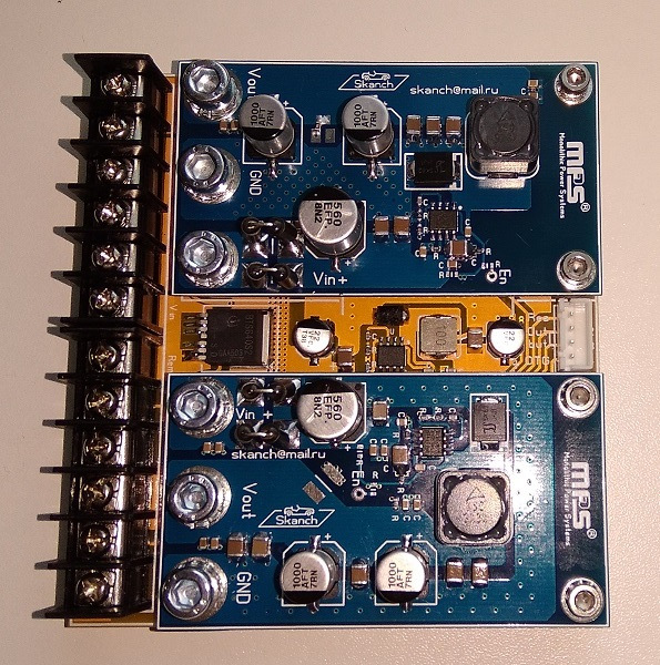 Это отдельный блок DC-DC на той же микросхеме LTM4600 с фиксированным выходом +/-5В и током нагрузки до 10А (радиатор обязателен). Это совместная разработка с basurman и топология платы этого модуля полностью его заслуга. Управление возможно как положительным потенциалом, так и отрицательным.
