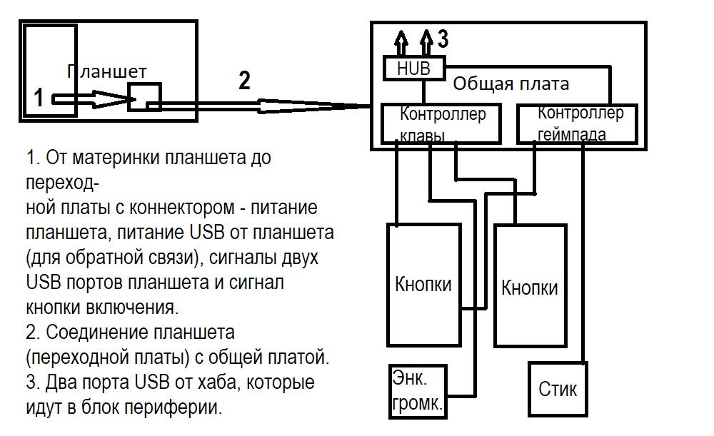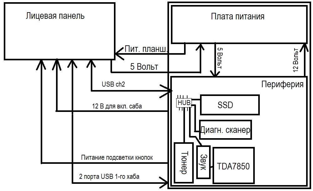 Когда летом в 2016 году купил машину, там был штатный мафон, из которого был выведен аукс, а потом мафон вовсе сдох. Я люблю музыку за рулём слушать, поэтому поставил 1DIN Pioneer с рамкой, но уже была идея поставить комп, а именно планшет. Штатная система, даже с монитором имеет не малую цену за комплект, а функционал так себе. С лета 2016 носил в голове эту идею, думал, что и как. Начал разработку и закупку компонентов в начале 2017 года. Я не хотел делать только сенсрное устройство, так как физические кнопки за рулём тактильно удобнее. Основа компа - планшет Teclast X80 Pro (Atom x5-8300, 2/32Гб, 8" FullHD). Вложение 50877 К нему клавиатура Defender Luna - использован контроллер из неё. https://a.d-cd.net/195e181s-960.jpg Геймпад Defender Omega - дешёвый геймпад, с него взят стик и контроллер, через программу Joy2Mouse заменяет мышку. https://a.d-cd.net/f8fced1s-960.jpg Клава и джойстик работают через простой USB HUB на 4 порта, очень простой, схема его из одной микросхемы и пары резисторов и конденсаторов, от этого же хаба выведены два канала - один для USB GPS приёмника (ниже), а второй обычно свободен для подключения флешек и т.д. https://a.d-cd.net/9d9ced1s-960.jpg У планшета два USB, один MicroUSB, второй есть в виде контактов под коннектор для FPC-шлейфа. Ко второму USB планшета подключён ещё такой же хаб на 4 порта. К нему подключены SSD диск на 120Гб через USB-адаптер, USB звуковуха ASUS Xonar U3, https://a.d-cd.net/422ced1s-960.jpg USB ТВ/FM тюнер AverMedia Volar T2 https://a.d-cd.net/97f4ed1s-960.jpg и диагностический адаптер BMW Scanner 1.4. Всё устройство можно условно разделить на две части - блок лицевой панели и блок перефирийных устройств. Лицевая панель сделана из двух листовых панелей акрила 3 мм вырезанных лазером и склееных между собой. В эту панель на эпоксидку вклеены посадочные места кнопок от штатного мафона, сам акрил прикручен винтами к П-образному алюминиевому профилю. Выравнивалось всё под покраску той же эпоксидкой, винты тоже залиты эпоксидкой. Затем всё покрашено матовой чёрной краской и покрыто прозрачным матовым лаком. Кнопки также штатные, только гравировка на них переделана. https://a.d-cd.net/1f5505s-960.jpg https://a.d-cd.net/b80d505s-960.jpg Также на панель выведен энкодер для регулировки громкости с ручкой от штатного монитора, и выведен стик от геймпада. В итоге до покраски это выглядело так: https://a.d-cd.net/7c870a9s-960.jpg https://a.d-cd.net/a9870a9s-960.jpg Далее выравниваем эпоксидкой и красим: https://a.d-cd.net/9b28d85s-960.jpg https://a.d-cd.net/25a8d85s-960.jpg https://a.d-cd.net/a498d85s-960.jpg Изготовление необходимых плат. Их разработка велась довольно долго, то лень, то времени нет, то ещё чего, но сделал. И так - общая большая плата, как своего рода монтажная плата для плата поменьше, к ней подключается питание планшета, подсветки, соединяются USB и прочее, ниже схема лицевой панели: Вложение 50878 К общей плате припаяны две небольшие платы с тактовыми кнопками, взятыми с той же штатной магнитолы, кнопка включения/выключения планшета, кнопка включения/выключения сабвуфера, которая работает через NE555 и включает реле, которое даёт питание на Remote усилителя саба и одновременно переключает подсветку кнопки сабвуфера с основной белой на красную, реле и схема с 555 на той же общей плате (реле маленькое на 2А), остальные кнопки это кнопки от контроллера клавиатуры, мультимедиа клавиши, горячие клавиши для программ и т.д., ещё пара кнопок, это левая и правая кнопка мыши, эти кнопки подключены к контроллеру геймпада. Две маленькие платы это энкодер с подсветкой и стик с подсветкой. Белая подсветк