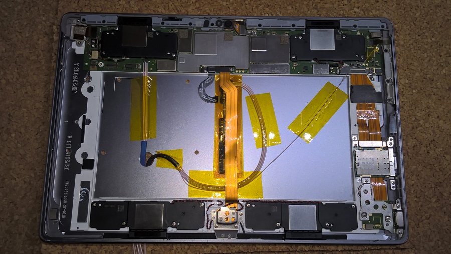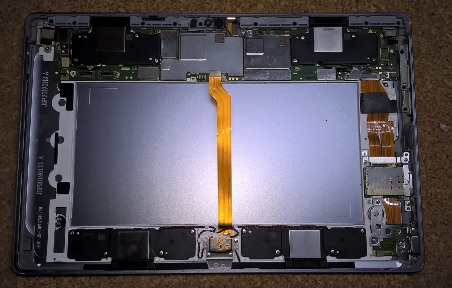 Планшет 10,8 дюймов. Батарея несъёмная. Чтобы до неё добраться, нужно отклеивать дисплей. Ко мне планшет попал с ещё не приклеенной матрицей после её замены, поэтому доступ к АКБ был свободный.