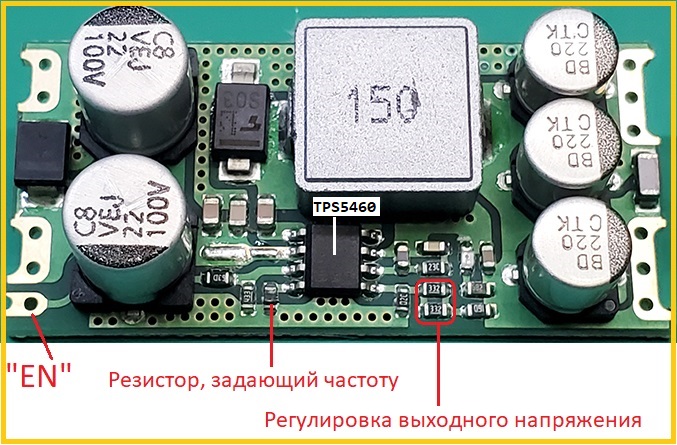 Достаточно качественный модуль на микросхеме TPS54560 для питания устройств в автомобиле. Реальный длительный ток нагрузки без дополнительного охлаждения 3.5А, при котором температура на микросхеме не превышает 65ºС. Просадку напряжения при кручении стартером держит отлично. Модуль имеет внешнее управление "EN". Частоту переключения и напряжение на выходе можно изменить, перепаяв несколько резисторов. Расчёт сопротивлений можно посмотреть в даташите.