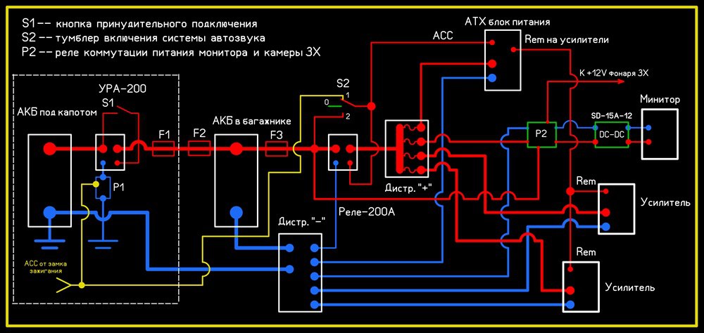 Теперь, что касается организации силовой линии питания всей системы автозвука. Всё, о чём буду говорить -- это моё мнение, не претендующее на "истину в последней инстанции", но реально работающее в машинах, в которых мне довелось делать монтаж аудиооборудования.