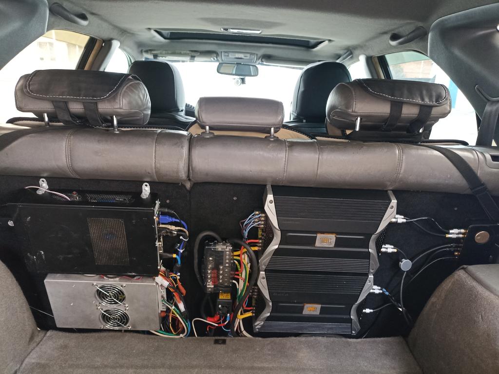 Ну, во-первых, нужно было разместить все компактно на двух задних сиденьях авто так, чтобы в процессе дальнейшей эксплуатации не возникало всяких неожиданностей.. Во-вторых, нужно было сделать основу, которая бы крепилась к самим сиденьям. Была выбрана 16-я усб плита, которую вырезали по лекалу каждой спинки. Потом обтянули эти части черным карпетом и на саморезы прикрутили к спинкам сидений. Получилось очень даже недурно. Лучше чем было)) В-третьих, нужно было сделать проушины блоку питания и системному блоку, чтобы их надежно прикрутить на свои места. В-четвертых, уложить кабели, которые выходят из системного блока, блока питания... Так уложить и закрепить, чтобы влияние вибрации не повлияло на разъёмы и тд.. За основу было использованы стяжки нейлоновые и площадки под эти стяжки.. В-пятых, всю эту закрепленную красоту нужно было надежно чем то защитить от возможных ударов, сдвигов и тд.. Пока в процессе. Ну вот как то так. Продолжение следует.... |