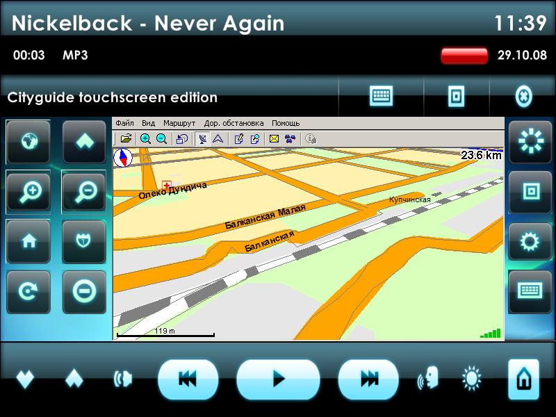 Попробовал использовать в машине бесплатную версию СитиГида 2.2. для стационарных компьютеров, встроил как внешнее приложение в Centrafuse. Встроилось, в целом, нормально, но, как выяснилось, в машине использовать крайне неудобно. Попасть пальцем в главное меню или пиктограммы на тулбаре во время движения практически невозможно. Как вариант, можно купить за 3 000 руб версию для CarPC, но моя "жаба" была со мной не согласна. Ну не понимаю я, почему эта версия стоит в 1.5 раза дороже КПК-шной. В итоге решил написать оболочку для СитиГида и вынести основные функции программы на большие кнопки. Вот что получилось: Вложение 8272 На мой взгляд стало намного удобнее, хотя и осталось несколько непрятных моментов. Тем не менеее, я пока отказался от мысли покупать CarPC версию программы. Выкладываю оболочку, если кому еще понадобится Вложение 8299. |