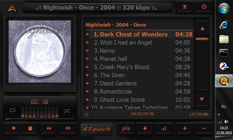 Кто хочет вообще посмотреть что это такое могут скачать его с офф сайта ввв.aimp.ру Итак для чего я вообще все это создал, а вот для чего пару бессонных ночей и я накидал скин для аимпа, причем как бы рассчитывал на управление пальцами. Вроде бы как получилось, покрайней мере мне удобно. Скин рассчитан на разрешение 800х600, но другие ему тоже не помеха. вообщем вот кому интересно могут заценить. Это главное окно : http://i055.radikal.ru/0909/29/d0182f008604t.jpg Это плейлист : http://s48.radikal.ru/i120/0909/d8/c20a692c5f5ft.jpg А это ссылка на сам скин : http://depositfiles.com/files/24loujcfn http://depositfiles.com/files/24loujcfn |