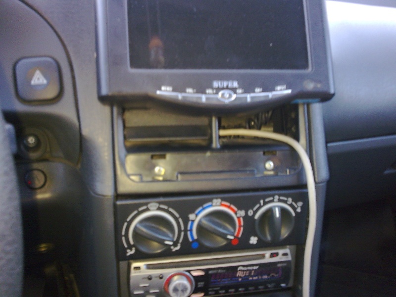 Тем самым местом о котором я говорил была решетка центрального обдува но поскольку по началу денег и подходящего компьютера в наличии не было а был монитор и китайская магнитолла shivaki с dvd и mpeg4 то было решено установить её в 2 din место и через линейный вход pionera подключить для воспроизведения звука что и было реализованно монитор был просто прикручен к решётки .