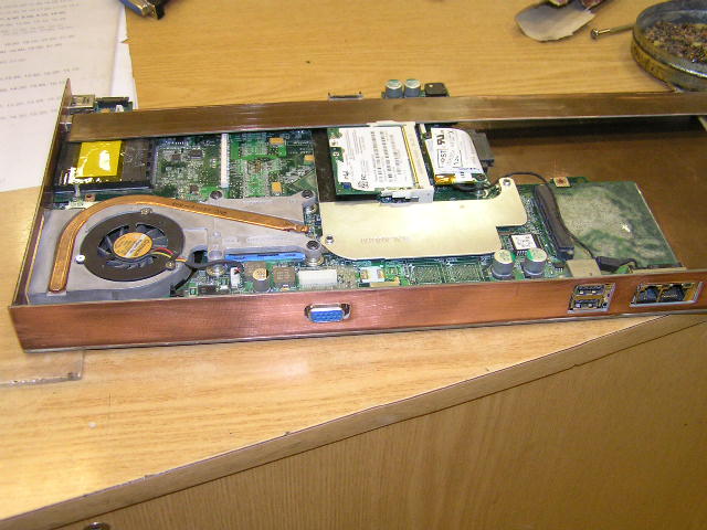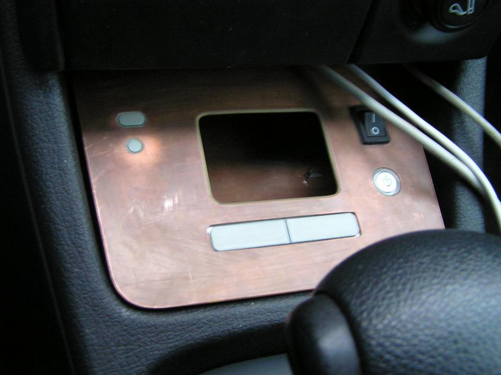 За основу (на первое время) решил приобрести ноут с разбитым экраном. донор был быстро найден (Тошиба М35Х), к тому же в придачу к нему был отдан точно такой же, но нерабочий. Позже решено упаковать материнку от него в самодельный корпус. Т.к. планировалось приобрести монитор без тачскрина, из второго ноута был выдран тачпад и вмонтирован в отдельную панель, которая устанавливается на место подстаканников, в ней же находится плата реле и кнопки включения ноута и усилителя магнитолы.