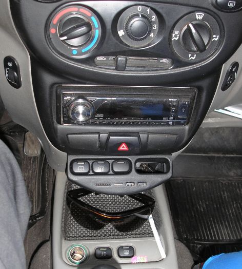 Еще небольшая доделка, у меня на калине стоит лобовое стекло с электрообогревом, в штатном исполнение лобового стекла шел контроллер который меня не устраивал, после чего был разработан свой. А это влекло за собой установку кнопок, решение было найдено, но было много свободного места и в голову пришло разместить усб разъемы для удобства управления. После долгих поисков было найдено интересное решение: USB 2.0 All-in-1 Transcend TS-RDP7K black (+ 3xUSB2.0). Куплен и распилен корпус как надо, врезан в новую задумку, вот что получилось, видно на фото