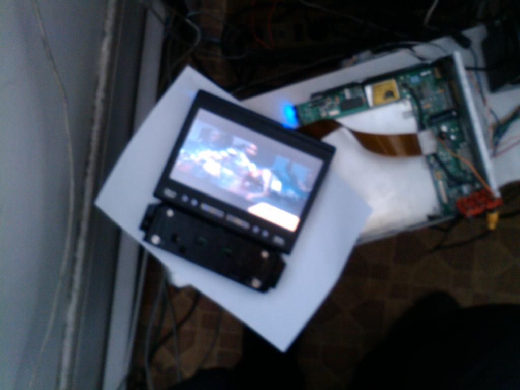 , так вот, нашел провод по которому идет композитный сигнал, разрезал дорожку, припаял RCA вход, но и тут меня ждало разочарование, хотя и сигнал от маленькой камеры показывал хорошо, при подключении к компьютеру, экран отказывался работать - изображение было ч/б и прыгало, думал я над этим 2 дня, спаял другой коннектор вместо старого переходника с s-video, но все ровно ничего не помогало, я подключил обычный телевизор и он конечно же заработал, после настройки подключения телевизора, вновь подключенный экран заработал, причем очень хорошо, и тут меня осенило