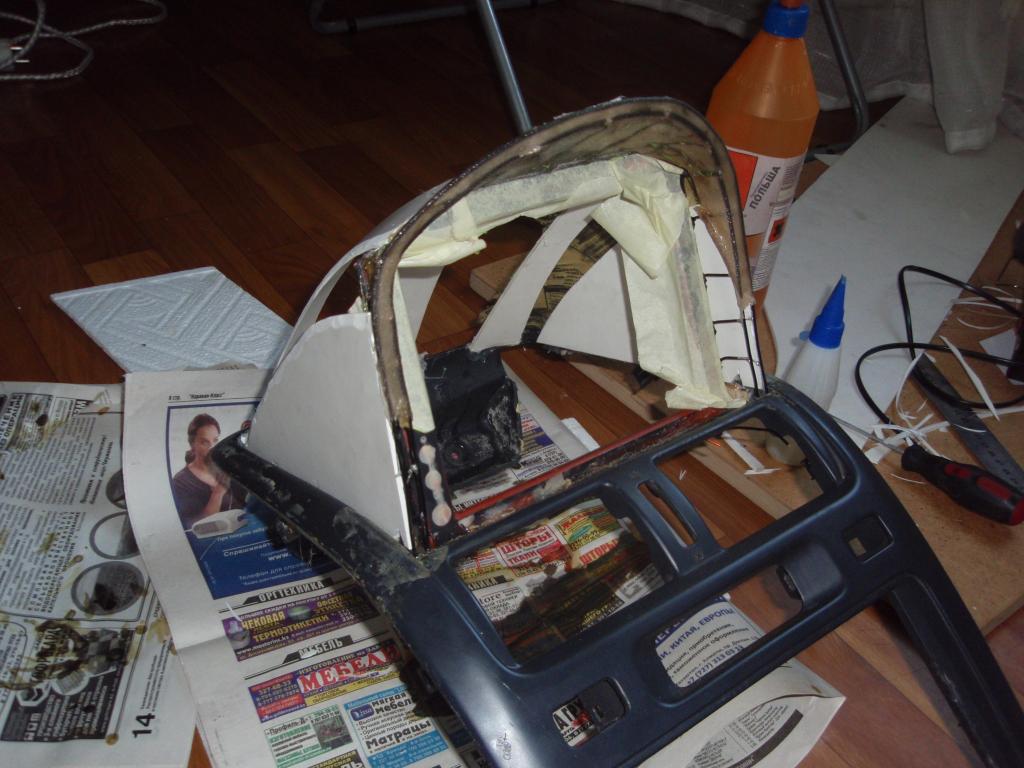 . Натягиваю на каркас и фиксирую нитками. Данная технология называется "Чулочный метод". Мажу эпоксидкой переднюю часть. На следующий день получаю конструкцию не очень прочную, но достаточную для дальнейшей работы. Далее ее армирую стеклотканью с эпоксидкой. Стенки болвана решил делать из ПВХ. Материал легко гнется и поддается обработке.