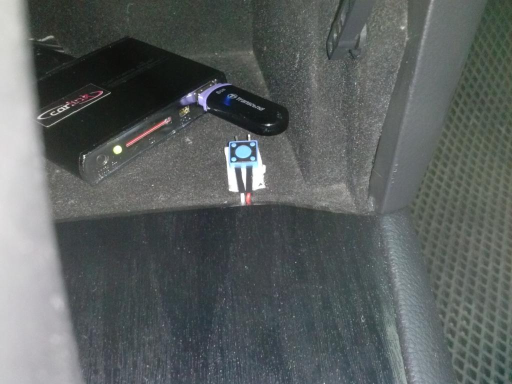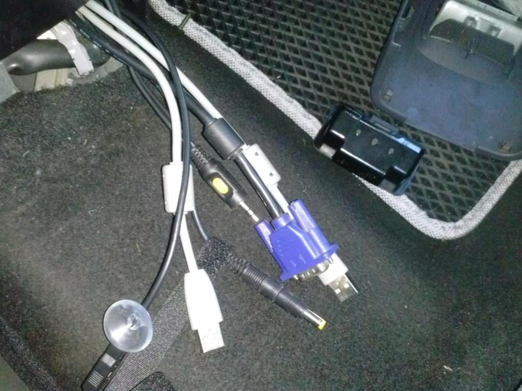 Ноутбук прячется под пассажирским сидением. GPS и GSM модем прячется под пластиковым козырьком сразу за панелью приборов. Прием стабильный и уверенный. Удлинители USB (модем, тач) взял хорошие, с фильтром – работают стабильно. VGA провод обычный и хилый на вид, остался от какого-то монитора, но работает без проблем.