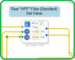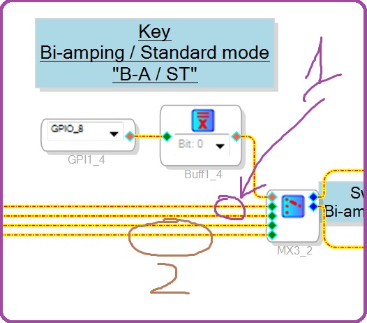 В комменте для фильтра номер_2 "2nd Order Filter 1_3" стоит "Stand / Bi-amp", то есть указывает нам на то, что работает и в режиме ST и BA, но по схеме видно, что переключение между этими режимами идёт на переключателе_4 "GPI 1_4", то есть либо сигнал идёт с фильтра номер_3 "2nd Order Filter 1_2" (а поступает сигнал на этот фильтр "прямиком" с MX1), что соответствует режиму "BA", либо (в зависимости от крутилок HPF и LPF, т.е. активации фильтра при переходе через щелчок при вращении по часовой стрелке):