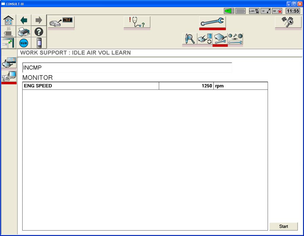 Первоначально программа показывает текущие обороты. После нажатия кнопки "start" идут сами команды обучения. При этом текущие обороты ДВС уже не идут от ECU. Consult-III, также как и TECU-III, терпеливо ждет от ECU подтверждения завершения обучения. В течении 5 минут такого ожидания ничего на окне Consult-III не поменялось. После выгрузил эмулятор ECU (равнозначно отключению зажигания на авто). В результате этого Consult-III сообщил, что обучение незавершено (INCMP).