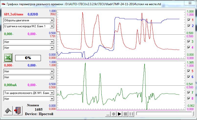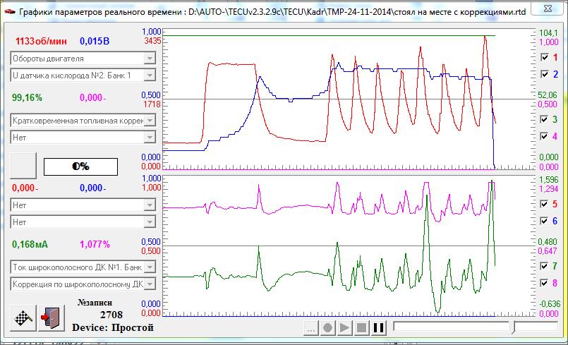 Ну, на мой взгляд, работают у тебя лямбды. Первая, широкополосная, моментально реагирует на изменение смеси. Вторая, судя по всему после каталика, почти всегда бедная. Но при активном газавании уходит в богатую. Я не уверен, но, думаю, так и должно быть.