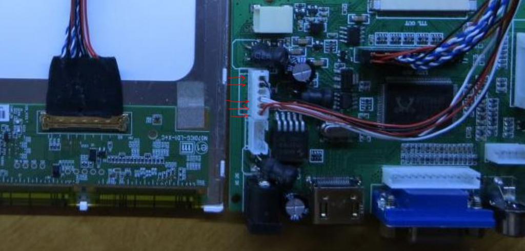 Разматываешь липучку на разьеме к матрице, и согласно таблице прозваниваешь. Получится должно как на фотке: красные +12 вольт, черные масса, два белых - один шим(регулировка яркости), второй включение подсветки. Сделай как на фотке и все будет ок)))