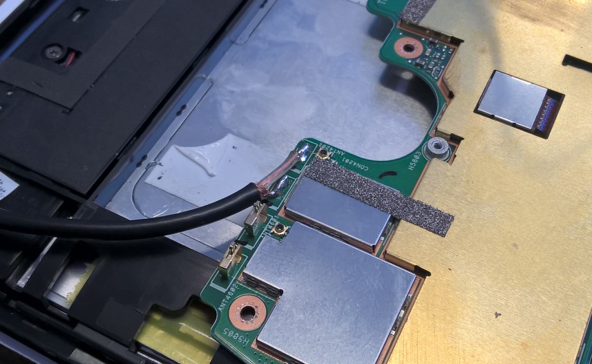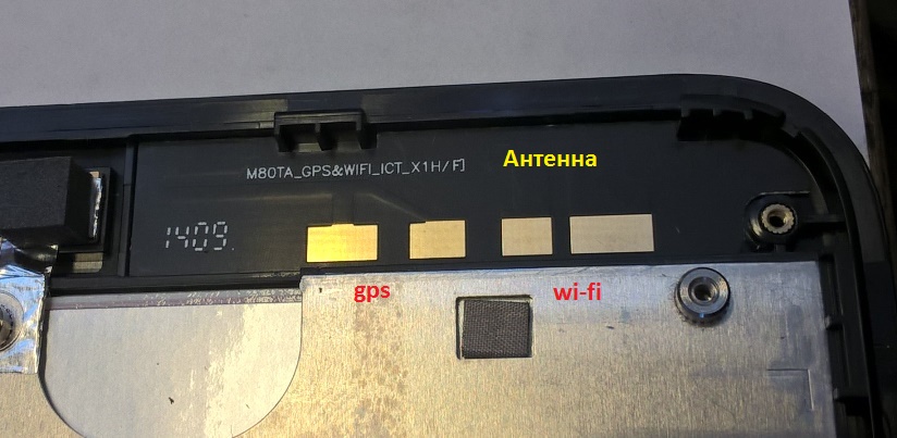 Так же обнаружил gps чип и wi-fi, ну и саму антенну - теперь понятно почему планшет практически отказывается ловить спутники, если и ловит то с большой погрешностью или вообще пропадает. Вспомнил, что в заначках валяется старая пассивная внешняя gps антенна. Нашел, подрезал провод на 50 см. отпаял контакты и припаялся непосредственно к площадкам платы.