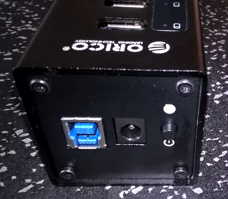 На корпусе ORICO кнопка включения питания без фиксации - чтобы коммутировать питание на HUB средствами "умного" блока питания придется ее зафиксировать в нажтом состоянии.