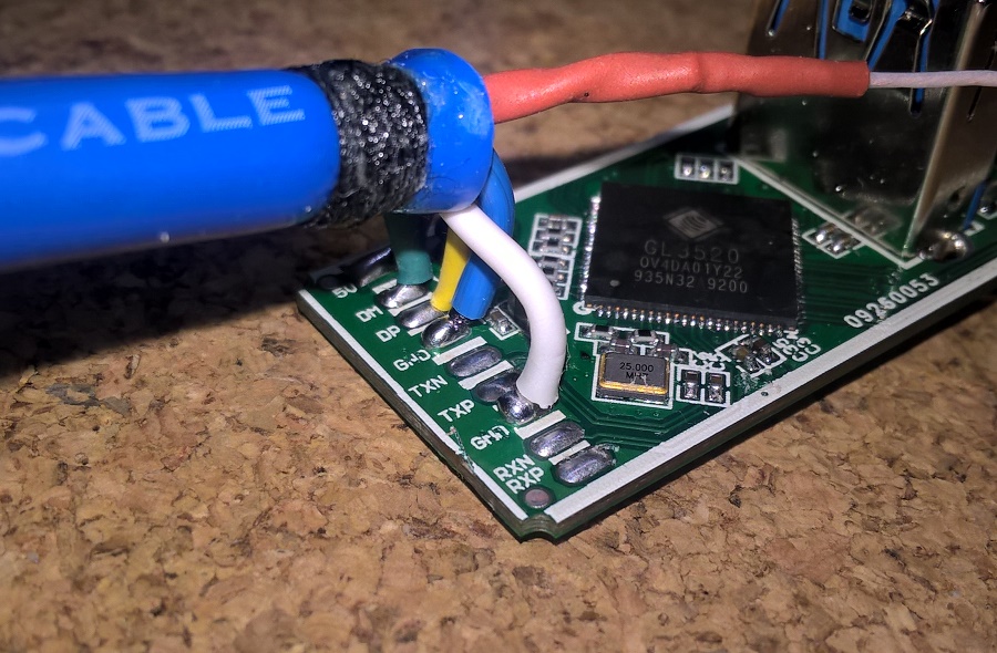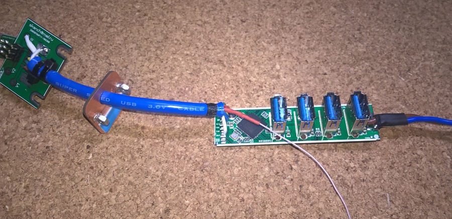 , который прошёл проверку и показал нормальные результаты. Собран на чипе GL3520 с поддержкой функции МТТ, на четырёхслойной плате, с разъёмом micro USB дополнительного внешнего питания. Качество пайки без нареканий. Очень маленький, корпус из облегчённого алюминия, толщина стенок 2 мм, что позволяет нарезать резьбу для фиксации на поверхности. При тестах охлаждения до - 25С в течение 3 часов и последующем включении все подключённые в HUB устройства определились без проблем. Ниже картинки доработки.