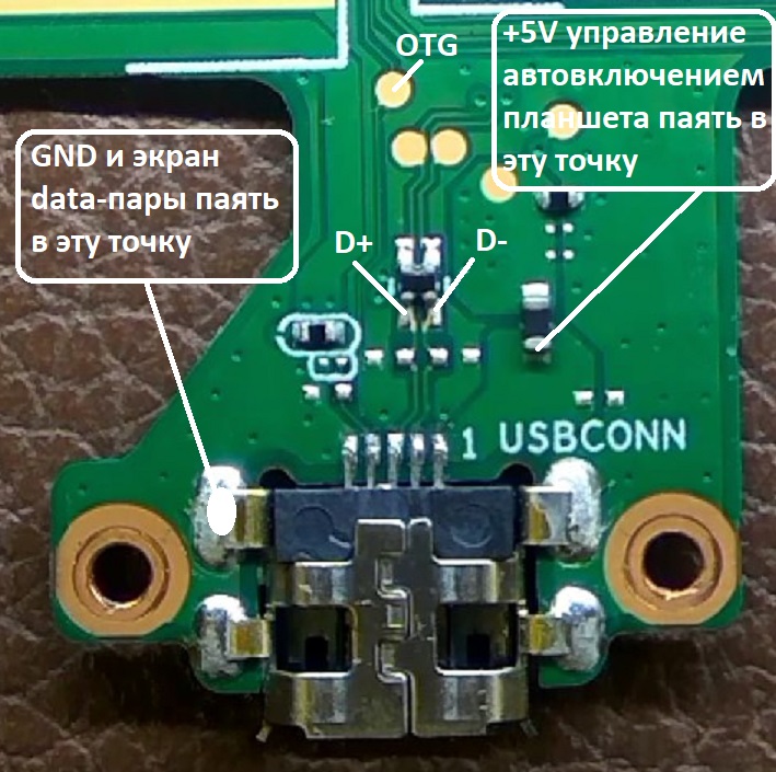 Что касается пайки линии USB внутри планшета, то для гарантированной работы этой линии, необходимо витую data-пару делать в своём собственном экране и паять только в определённых местах на плате.