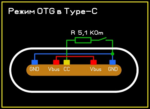 OTG в Type-C подключать на "массу" через резистор 5,1 KOm, как на рисунке.