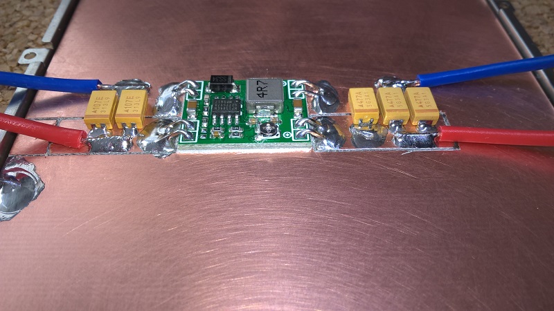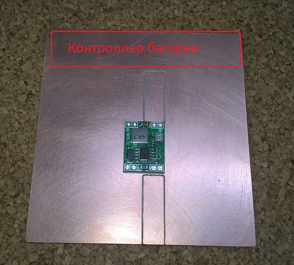 Преобразователь размещаем по середине, сместив от края, где будет находиться подготовленный контроллер от батареи и в фольге делаем прорези, формируя дорожки питания линии "плюс". Должны быть достаточно широкие 1-1,5 см.