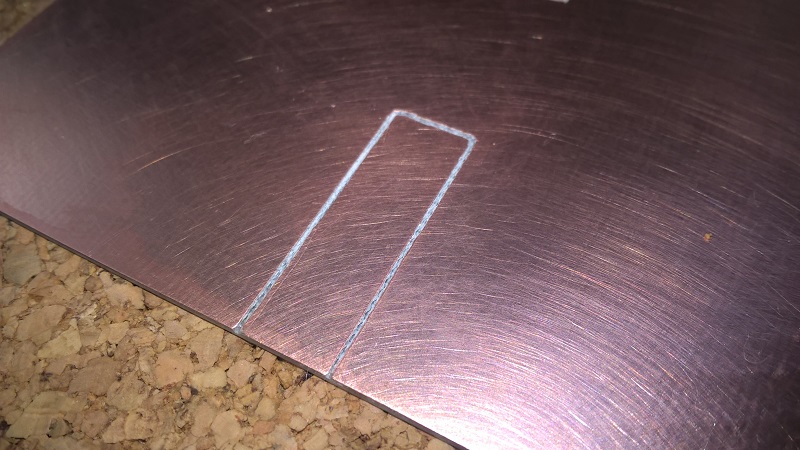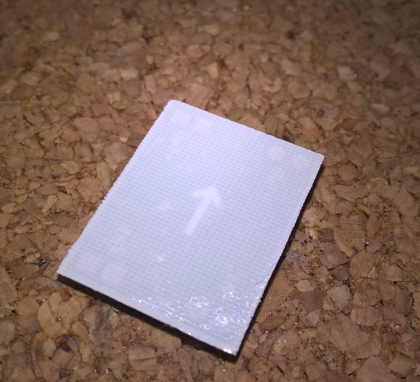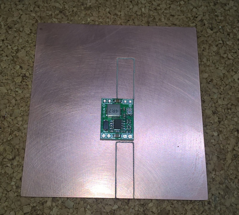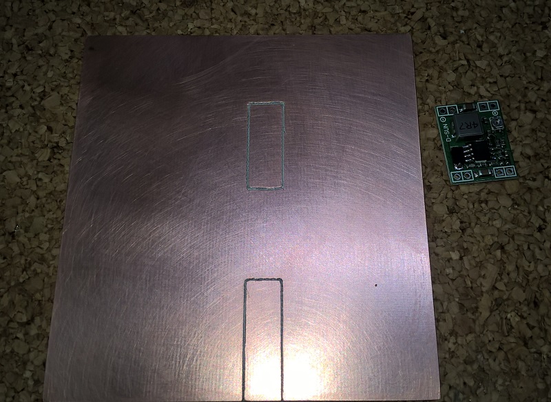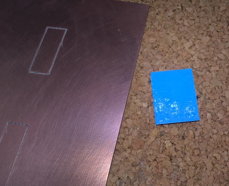 По внутреннему размеру рамки вырезаем прямоугольник из фольгированного стеклотекстолита - медный слой будет выступать в роли радиатора (теплоотвода) от DC-DC преобразователя. Достаточно толщины стеклотекстолита в 1,2 мм. Толщина медного слоя 35 мкм (чем толще слой, тем лучше теплоотвод).