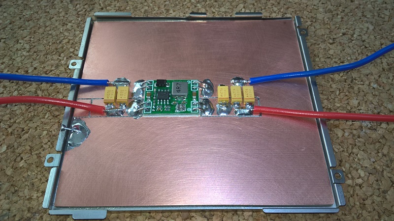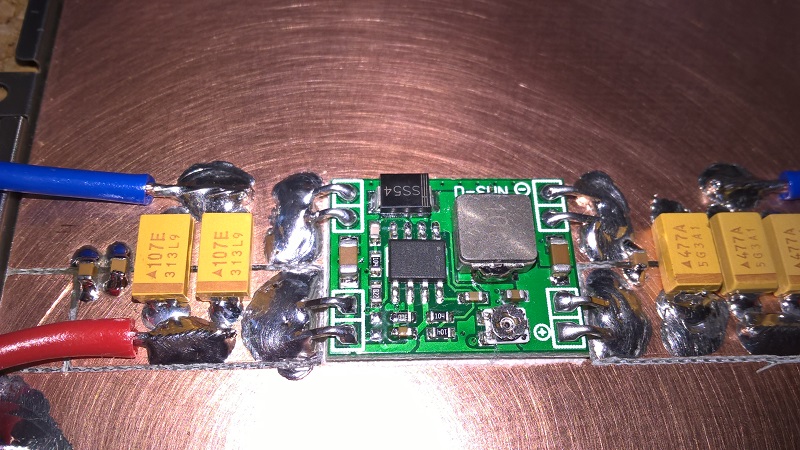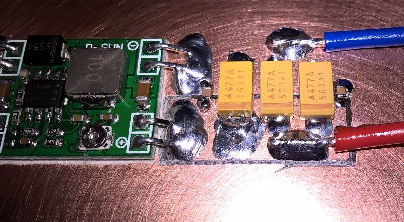 Конденсаторы использую танталовые: на входе два по 100 мкФ на 25V, на выходе три по 470 мкФ на 10V. Танталы лучше выбирать с большим запасом по напряжению в 3-4 раза. Провода сечением 0,75 мм.кв. Приклеиваем получившуюся плату к рамке на оставшийся скотч (или на новый).