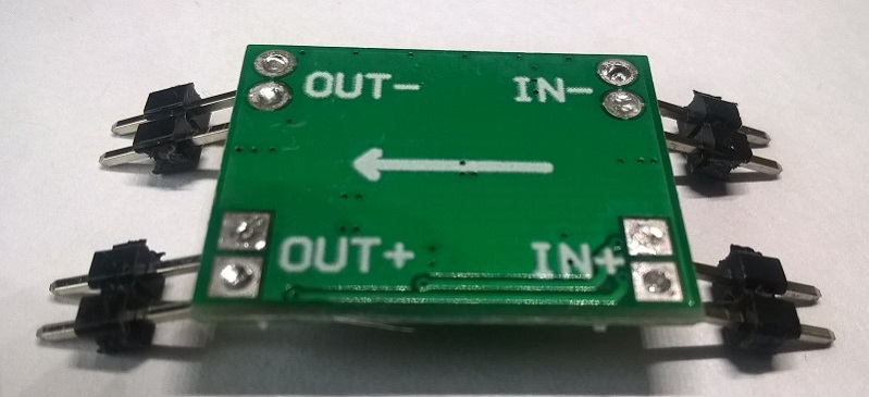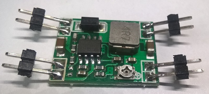 Немного доработал модуль: заменил индуктор на 10µH, диод Шотки поставил SS54, частоту переключения выставил на 900kHz (на "стоке" была максимальная 1500kHz), добавил керамических конденсаторов по 0,1 мкФ на вход и выход.