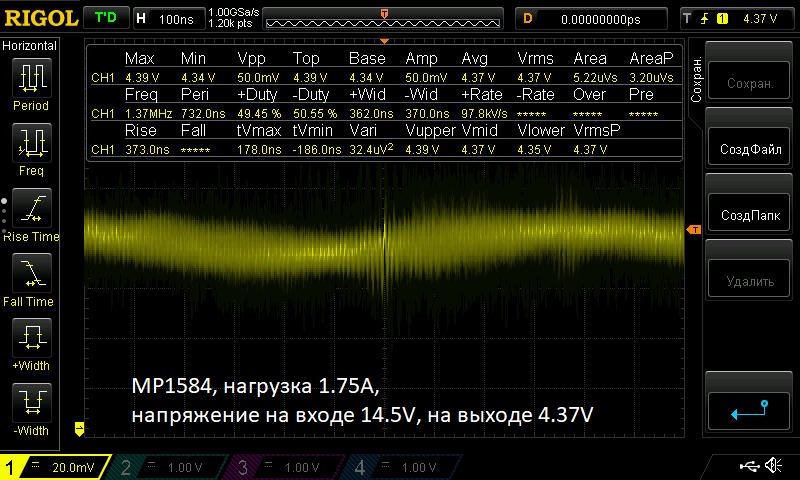 Общая высота получившейся конструкции 5,6 мм. Зазор между матрицей планшета и рамкой с платой получается "штатный". Тестирование проводил при комнатной температуре в течении 4 часов под непрерывной нагрузкой в 1,75А. Температура на корпусе микросхемы не поднялась выше 57С (самым "слабым звеном" является диод Шоттки и греется он сильнее микросхемы). Ниже осциллограмма теста (ток нагрузки 1,75А, напряжение на входе 14,5V, на выходе 4,37V, пульсации 50 mV). И это с минимальными доработками. Если преобразователь подготовить по рекомендациям, то температура на микросхеме будет ещё меньше и стабильность напряжения на выходе возрастёт.