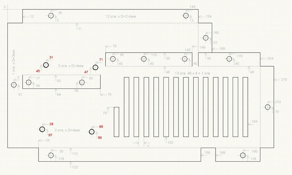 Расположение отверстий на боковых стенках корпуса для крепления к штатным кронштейнам. Вторая стенка - аналогично. Размеры указаны от верхней и левой границы детали.