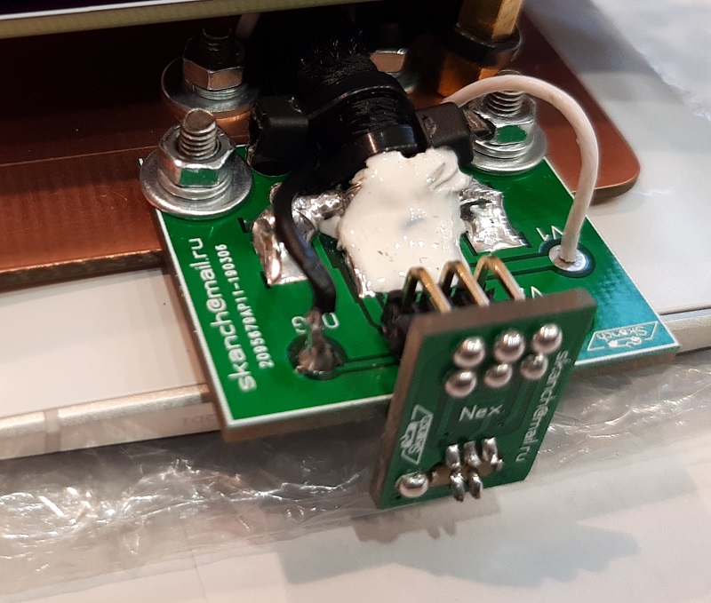 "Плюс" паяю на соответствующую контактную площадку на контроллере, "минус" на общую "массу" на материнской плате ( я выбрал ближайший корпус экрана). Сечение проводов по 0.75 мм2.