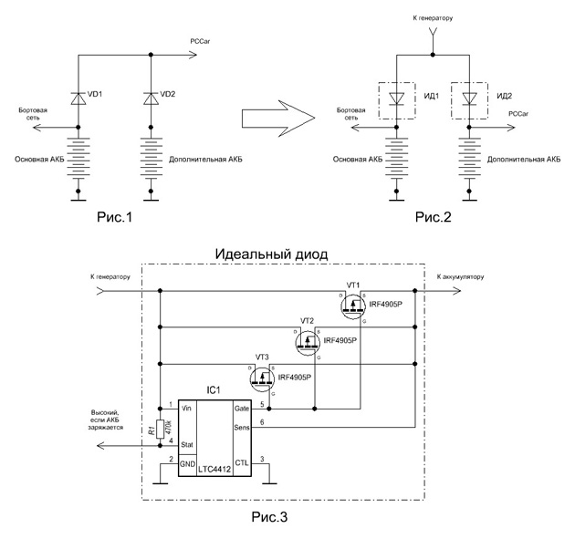 Причем от обсуждаемых схем (рис.1) – предлагают стандартную схему с диодными сплиттерами на рис.2. При этом получается независимая работа и зарядка обоих аккумуляторов.