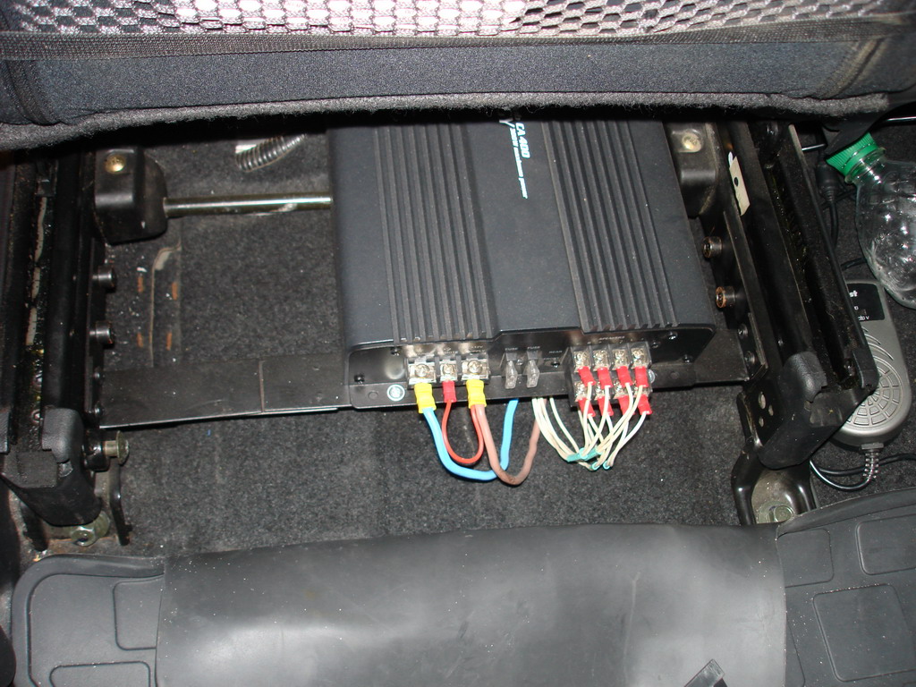 а эт моя гордость - кронштейны для усилителя под водительским сиденьем. В кресле не просверлил ни одной дырки, использовал наделанные заводчанами, даже болты черненные нашлись