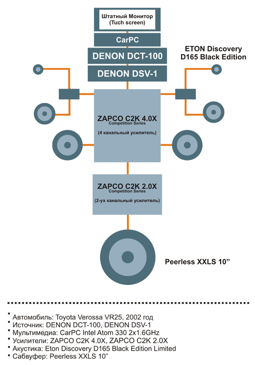 аудио: Denon DCT-A1, DENON DSV-1, Denon DCH-470, Eton Discovery Black Edition Limited, Zapco C2K 4.0x, Zapco C2K 2.0x, Peerless XXLS 10"
