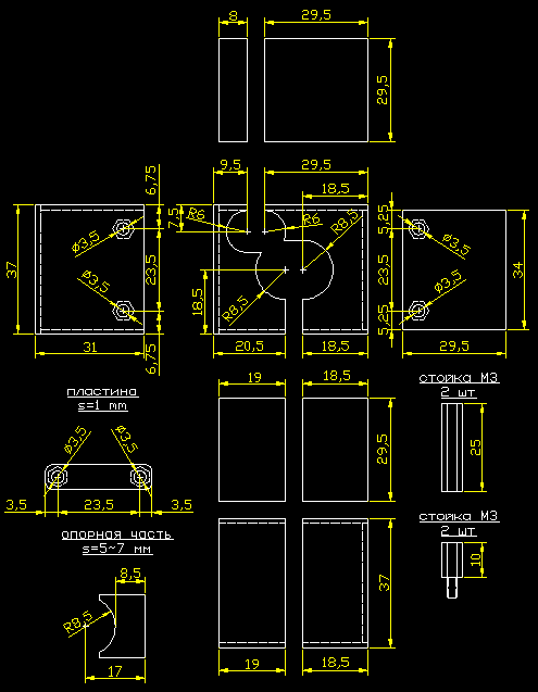 1. Покупка камеры (http://pccar.ru/showpost.php?p=53095&postcount=61) 2. намеки don_ik_kot-а на то что надо корпус мутить 3. Творение того же don_ik_kot-а - подиум под моник. штатное крепление камеры за пату не понравилось ввуду того, что вся нагрузка идет на плату - раз. ц.т. смещен в сторону объектива и вообще рычаг большой - и как следствие большие вибрации. В процессе осмотра выявлена мет. станина в которую вкручен объектив, а с другой стороны прикручена плата. станина в виде кубика из которого торчит цилиндр диаметром 16 мм и высотой 10 мм. - дальше уже идет объектив. решено зацепится за этот цилиндр. Материал принят текстолит двусторонний 1,5 мм, крепеж - винты, стойки для плат, винты и пайка. Закрепление камеры: в основание (на чертеже справа) вкручиваются стойки 20 мм. между стойками помещается опорная часть. толщина и материал еще не определены. где-то 5-7 мм толщиной, из меди или пластика - есть и то и то что-нибудь подберу - можно толстое оргстекло. затем на опорную часть помещается камера. и прижимается пластиной, которая крепится в высокие стойки - маленькими, у которых есть винт на одном конце. Далее в эти стойки крепится крышка. основание и крышка из текстолита - такие "полукоробочки". те же винты, что вкручены в стойки будут удерживать подвес, который я сделаю позже, примеряя камеру в корпусе - но гнуть я его буду из жести, которая остается от комповых заглушек. Спасибо за советы по монтажу cool-64 ![]() Чертеж прилагаю.