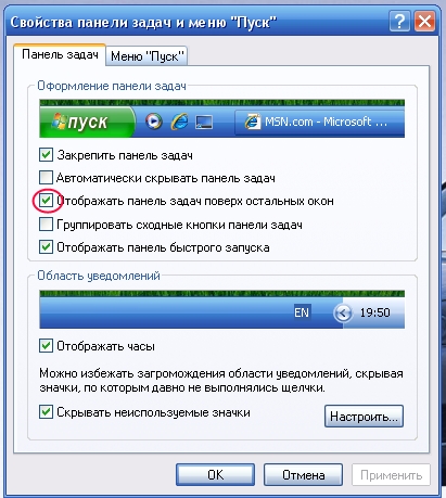 у меня ХР и я просто убрал эту галочку и когда программа запущена она накладывается на тул бар (и его не видно) и в тоже время когда прога свернута тул бар видно и мож тыкать в нее