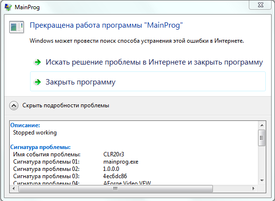 Буду признателен за выложенный отчет об ошибке. В скиншоте немного видно, что проблема в библиотеке набора AForge или дальше. Есть опасения, что запись авишки через Microsoft AVI в семерке не работает. |